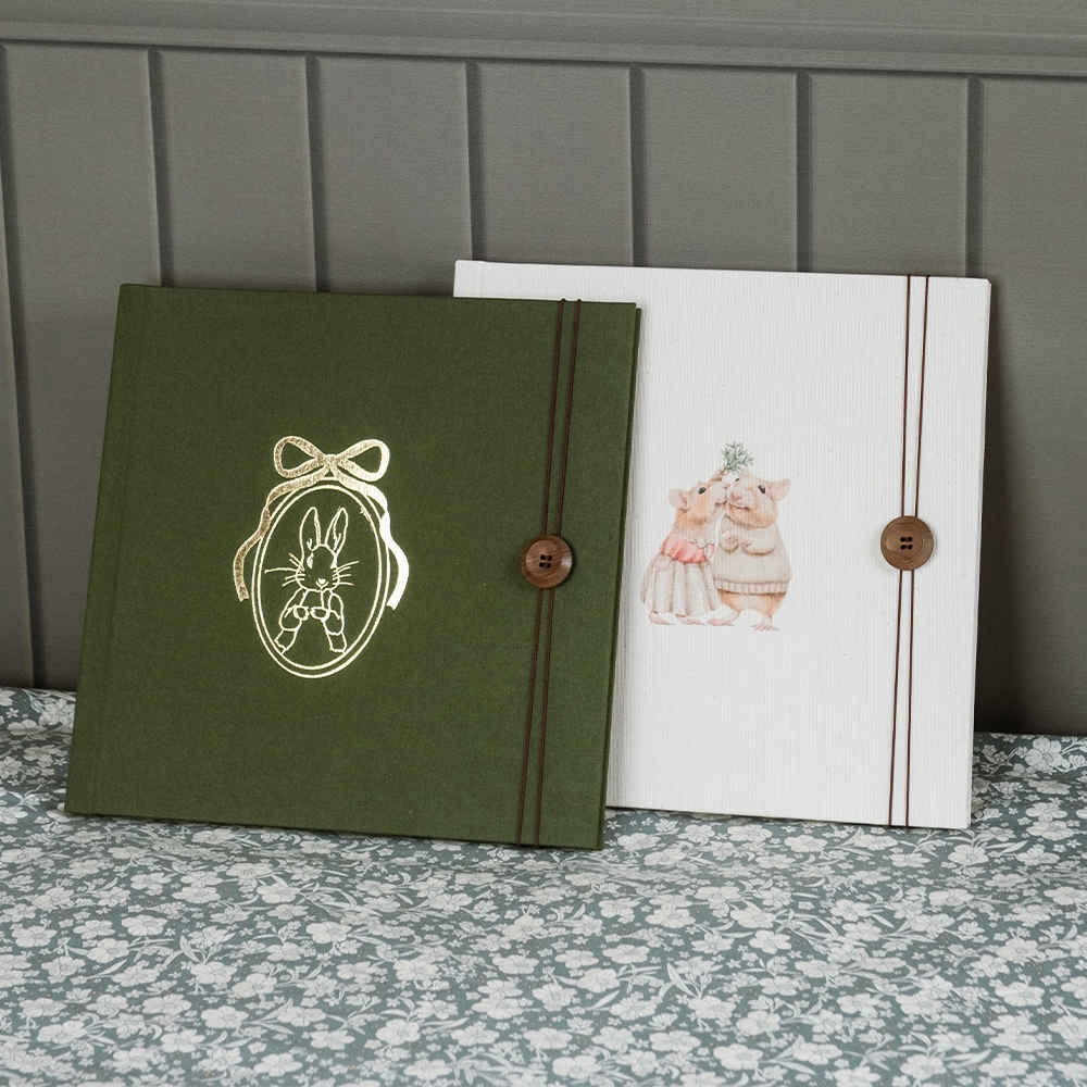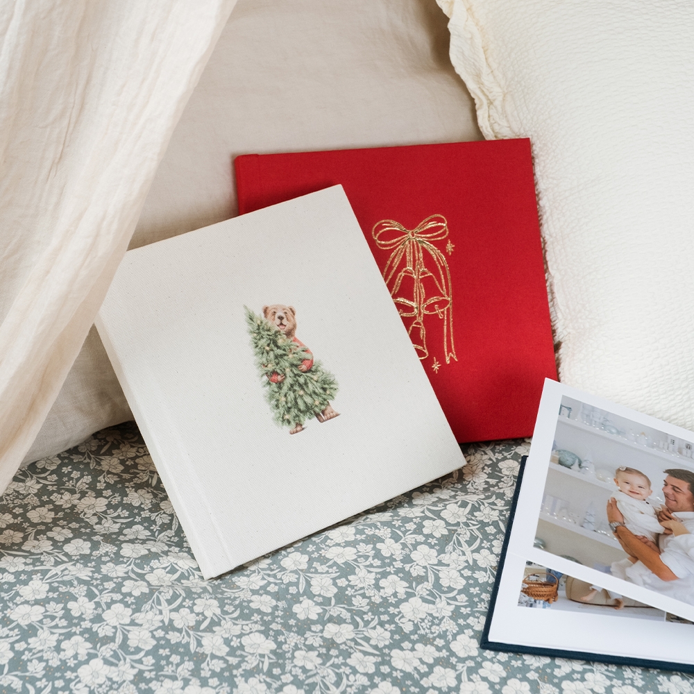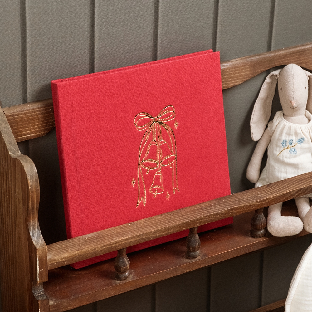 Com um design acolhedor e cheio de charme, o Christmas Book destaca-se pelo botão personalizado e pelo elástico castanho que envolvem a capa em buckram, disponível em tons natalícios como Verde, Vermelho, Navy ou Natural Pure. O botão é um extra que podes acrescentar para um toque ainda mais especial. Se preferires algo mais simples, também podes optar por uma versão sem botão nem elástico, para um visual mais clean e contemporâneo.
