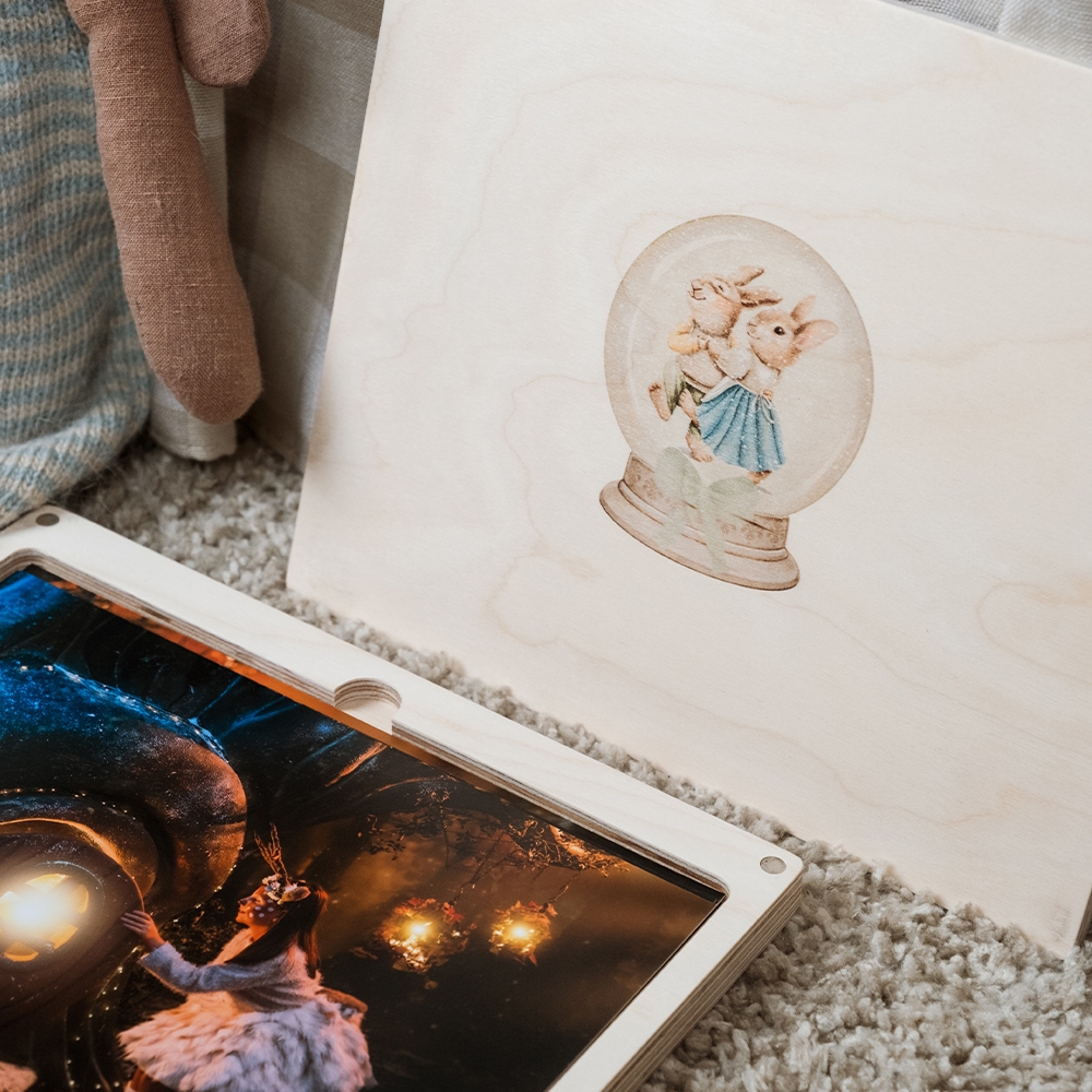 A Christmas Print Box Santa é ideal para quem aprecia o estilo clássico com um toque rústico. Fabricada em madeira contraplacada com acabamento nogueira, esta caixa acomoda 10 fotografias e permite personalizar o interior com diversos templates de Natal. Um presente artesanal, elegante e perfeito para guardar as tuas melhores memórias natalícias.