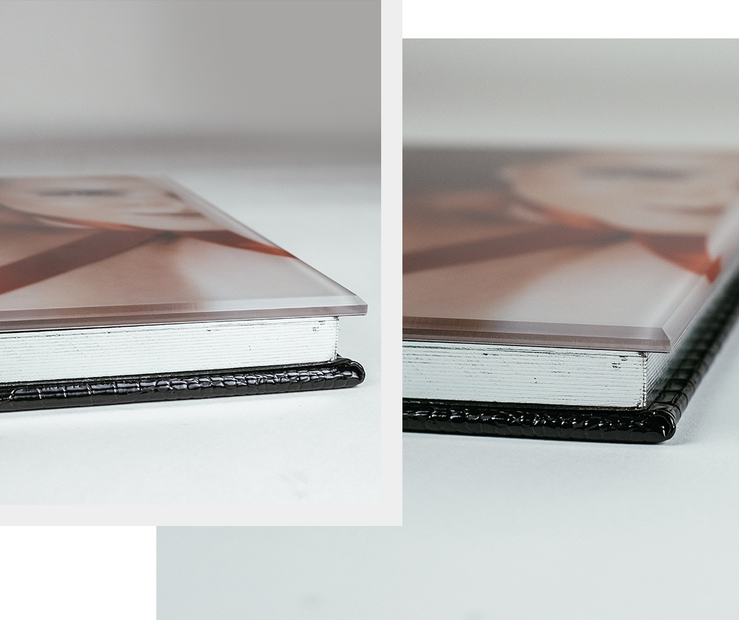 A personalização Acrylic Edge permite adicionar um acabamento boleado ao acrílico. A curvatura no acrílico proporciona uma visão quase tridimensional e oferece ao álbum um acabamento premium e arrojado.