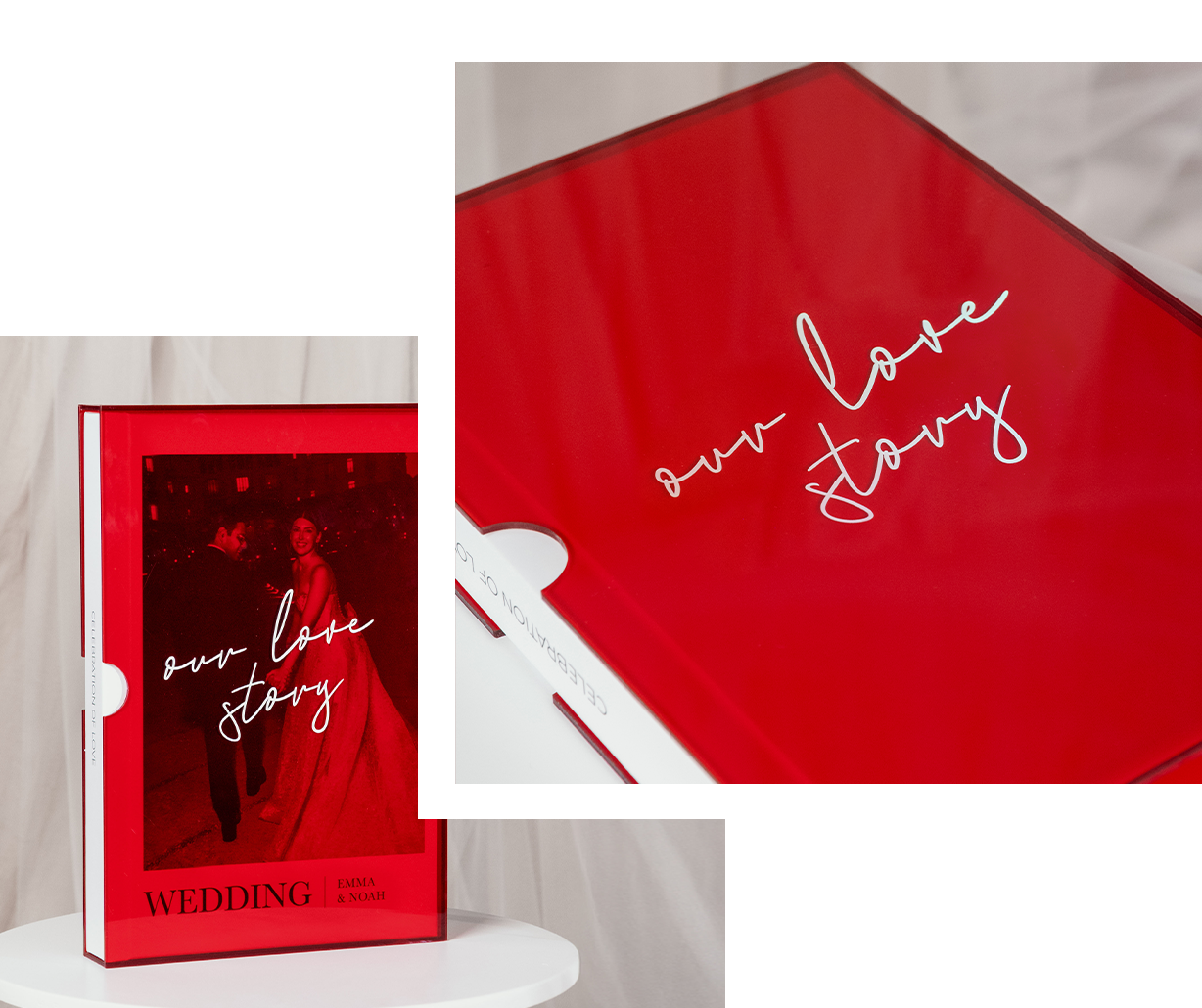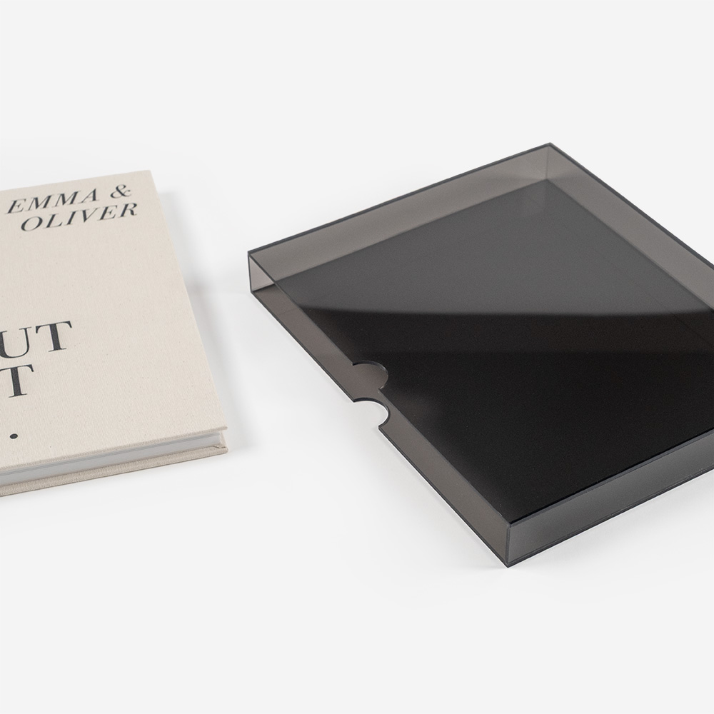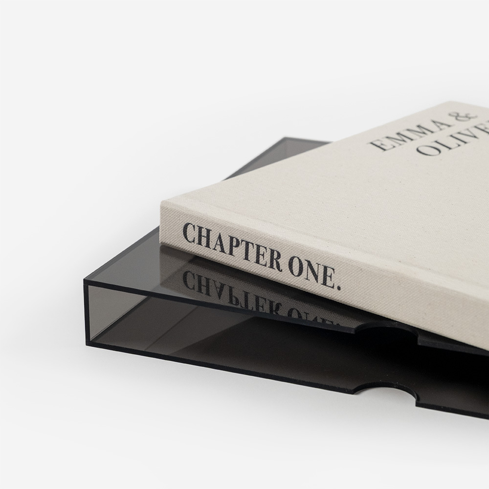 O acrílico é um material resistente, elegante e versátil, que protege e valoriza os teus produto. Disponível em várias opções, adapta-se a diferentes estilos: o incolor destaca a pureza e transparência, e o colorido adiciona um toque sofisticado, que transforma cada álbum numa peça única.